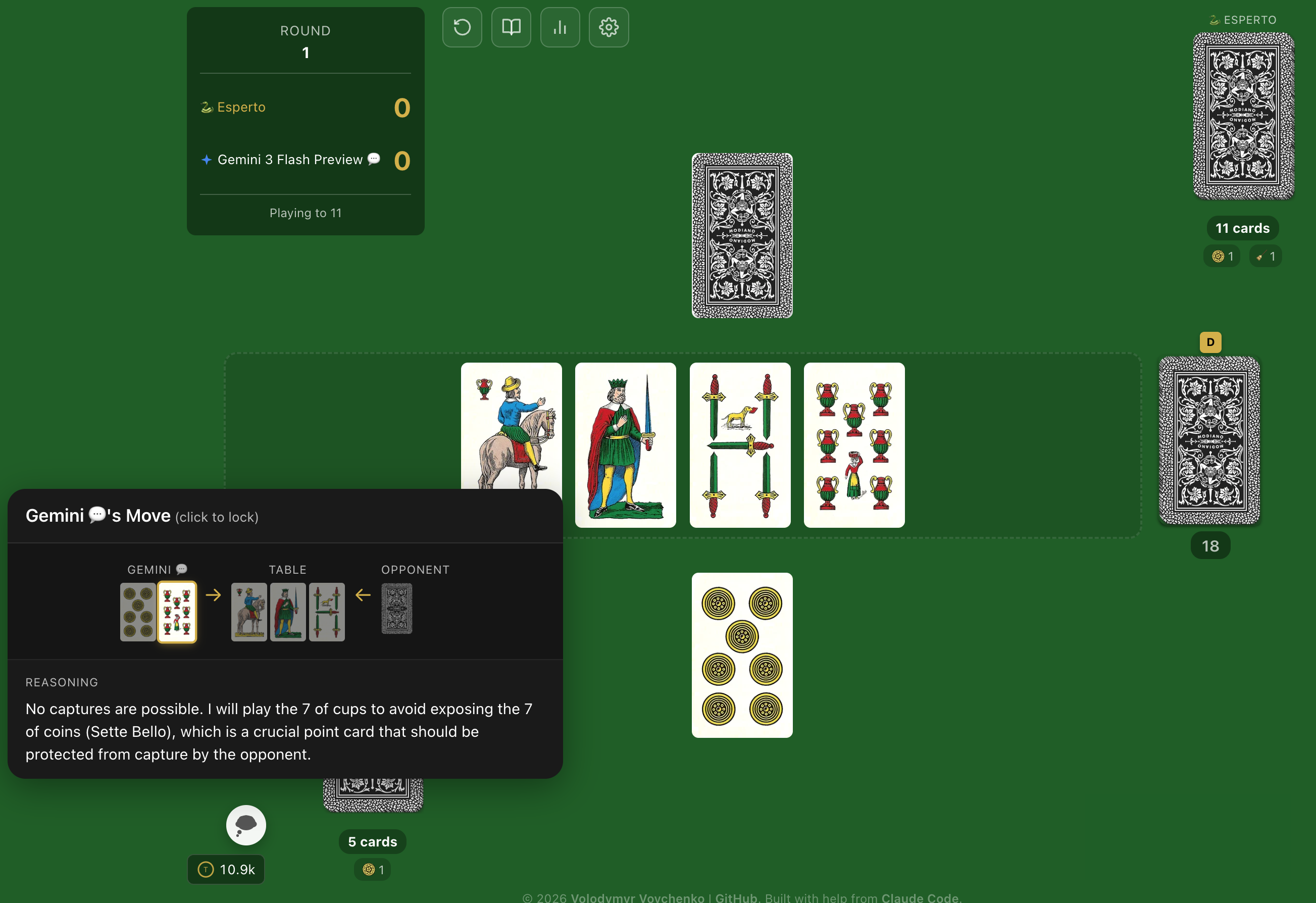 Built with React + TypeScript. Source code: github.com/vlvovch/scopa-ai