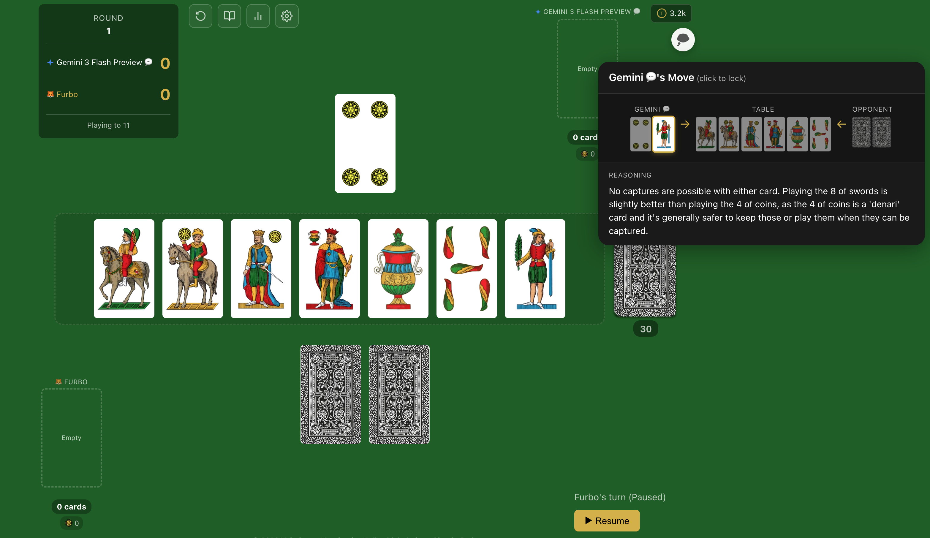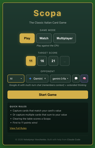 Note: This embed supports CPU opponents. For AI opponents (requires API keys) and multiplayer, play the full version at scopa-ai.vovchenko.net